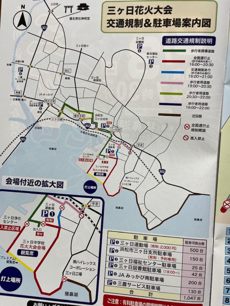 それでも、お帰りの際は渋滞が予想されますので、豊橋方面の方は西側、浜松方面の方は東側の少し離れた駐車場に停めていただきますと、比較的すんなりと帰宅できると思われます。(地元民からのオススメ。笑)