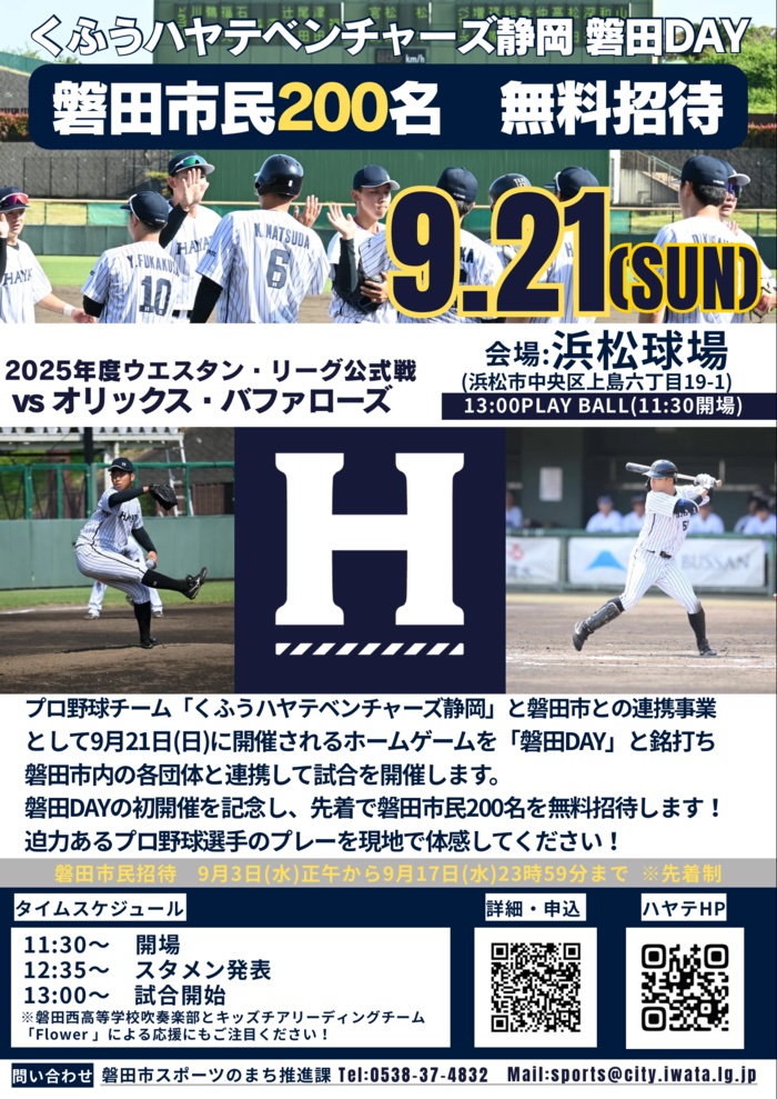 静岡県内初のプロ野球チーム「くふうハヤテベンチャーズ静岡」の試合に磐田市民の皆さまをご招待します。