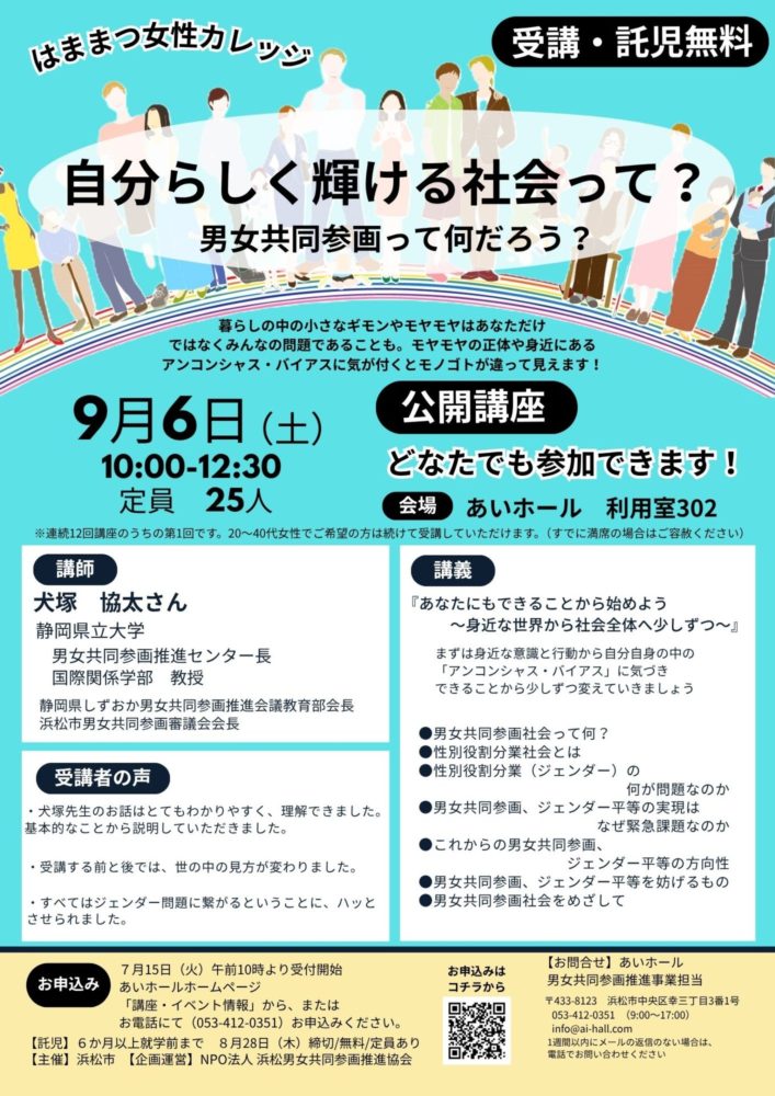 - あいホール, はままつ女性カレッジ, 男女共同参画, 自分らしく輝ける社会