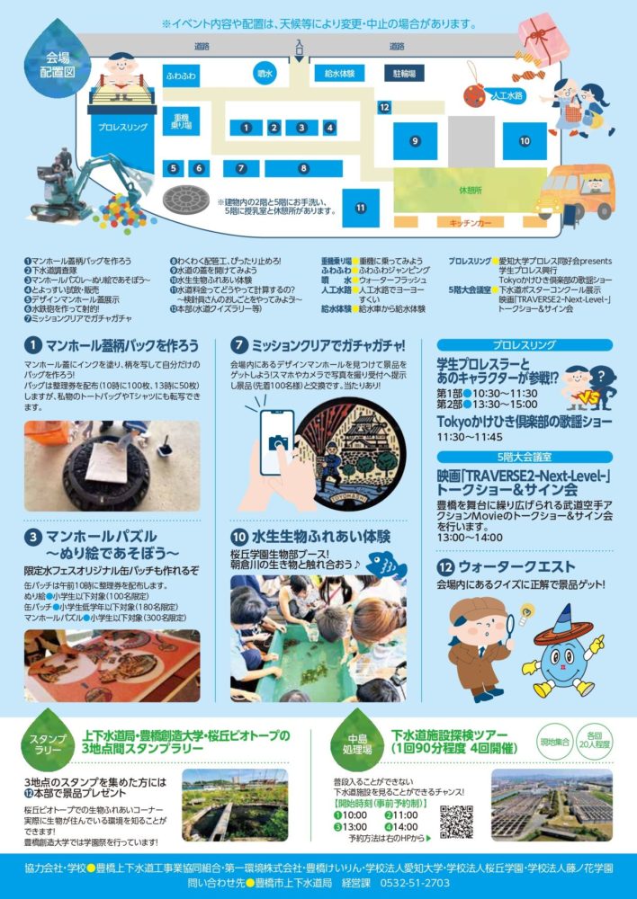 イベント内容:マンホール蓋型バック作り、マンホールパズル、水生生物ふれあい体験、ウォータークエスト 他