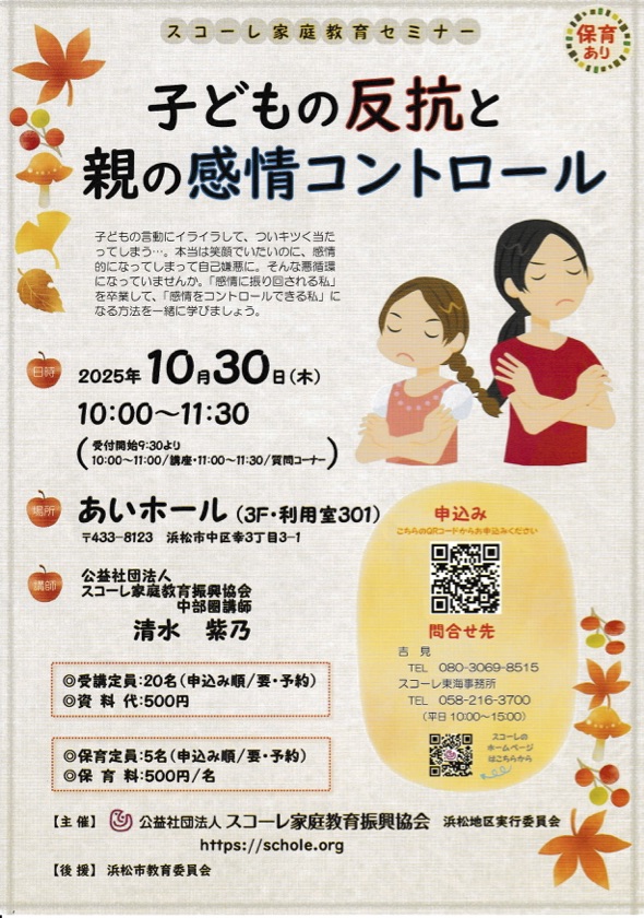 スコーレ家庭教育セミナー 子どもの反抗と親の感情コントロール