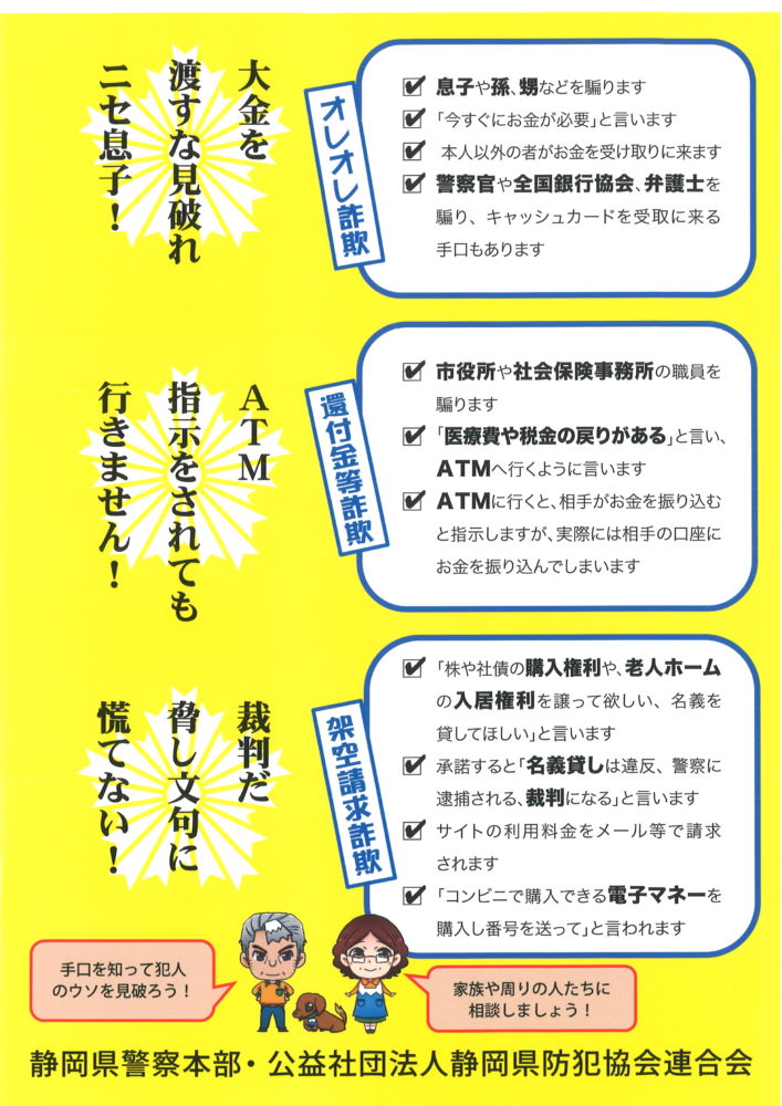 オレオレ詐欺・還付金等詐欺・架空請求詐欺の手口を知ろう!