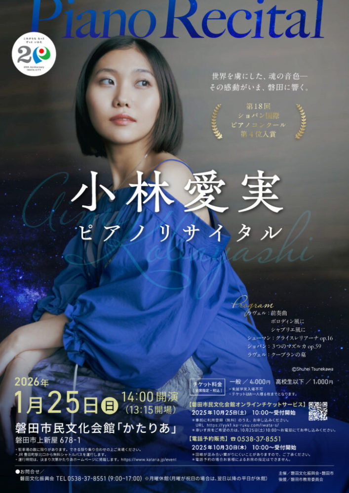 | チケット販売 | 【オンラインチケット発売】 販売開始:令和7年(2025年)10月25日(土)10:00~ 磐田市民文化会館オンラインチケットサービス(座席選択可) https://yyk1.ka-ruku.com/iwata-s/ ※事前に利用登録(無料)が必要【電話予約発売】 販売開始:令和7年(2025年)10月30日(木)10:00~ 電話:0538-37-8551 磐田文化振興会 ※回線が混み合い、繋がりにくい場合がありますので、 予めご了承ください。 ※座席指定はできません。 |