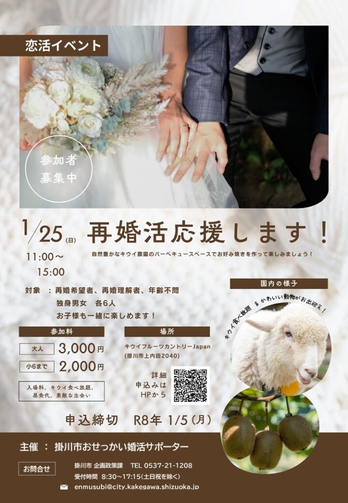 対象:地域・年齢不問 独身男女 各6人(応募者多数の場合、抽選) 再婚希望者 再婚理解者 ※イベントにはお子様連れで参加可能ですが、託児サービスはありません。あらかじめご了承ください。