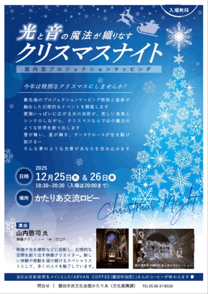 | 内容 | 最先端のプロジェクションマッピング技術と音楽が融合した幻想的なイベント。 磐田市在住の映像クリエイター山内啓司氏が演出を手掛け、クリスマスならではの魔法のような世界を創り出します。 当日は自家焙煎をメインとした「A R V A N C O F F E E(磐田市加茂)」さんのコーヒーが味わえます。温かいコーヒーを飲みながらほっとする素敵なひと時を過ごしませんか。 |