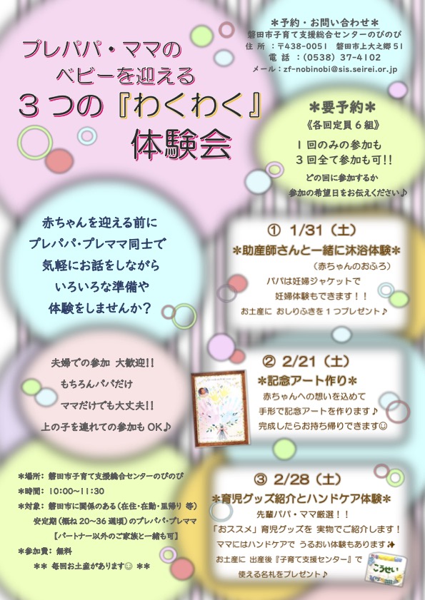 赤ちゃんを迎える前にプレパパ・プレママ同士で気軽にお話をしながらいろいろな準備や体験をしませんか?