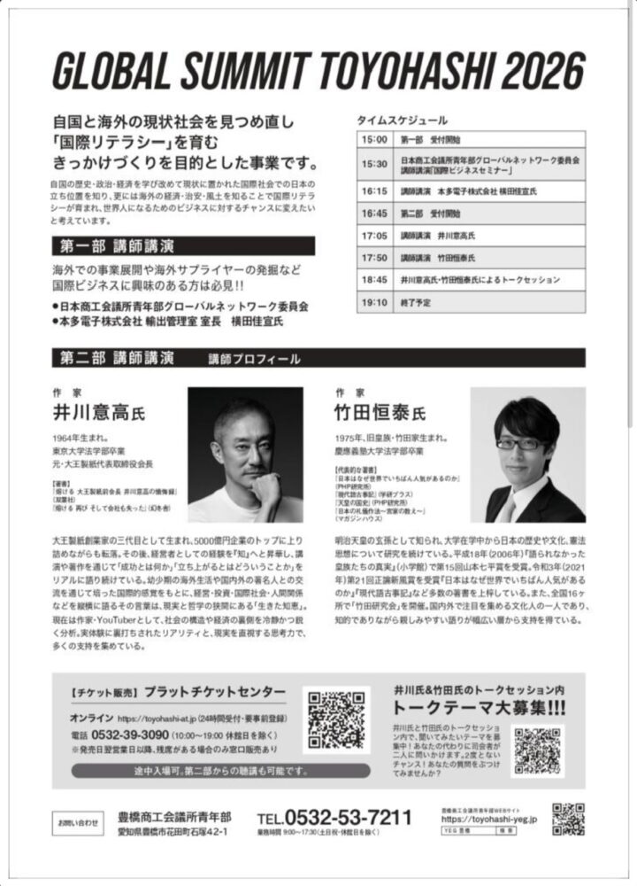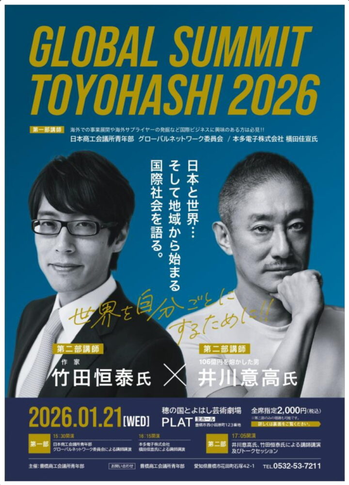 - GLOBAL SUMMIT TOYOHASHI 2026, 井川意高, 国際リテラシー, 竹田恒泰, 豊橋商工会議所青年部