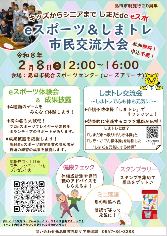 【内容】eスポーツ体験会・しまトレ体験・ミニ落語(社会人落語家 月の輪熊八氏)・レクリエーション・体組成測定・保健師&理学療法士&歯科衛生士健康相談・スタンプラリーなど