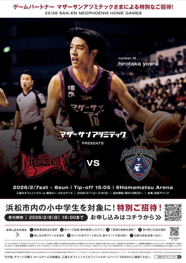 男子プロバスケチーム「三遠ネオフェニックス」浜松市内小中学生招待