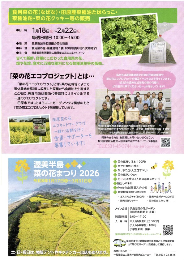 食用菜の花(なばな)・田原産菜種油たはらっこ・菜種油粕・菜の花クッキー等の販売