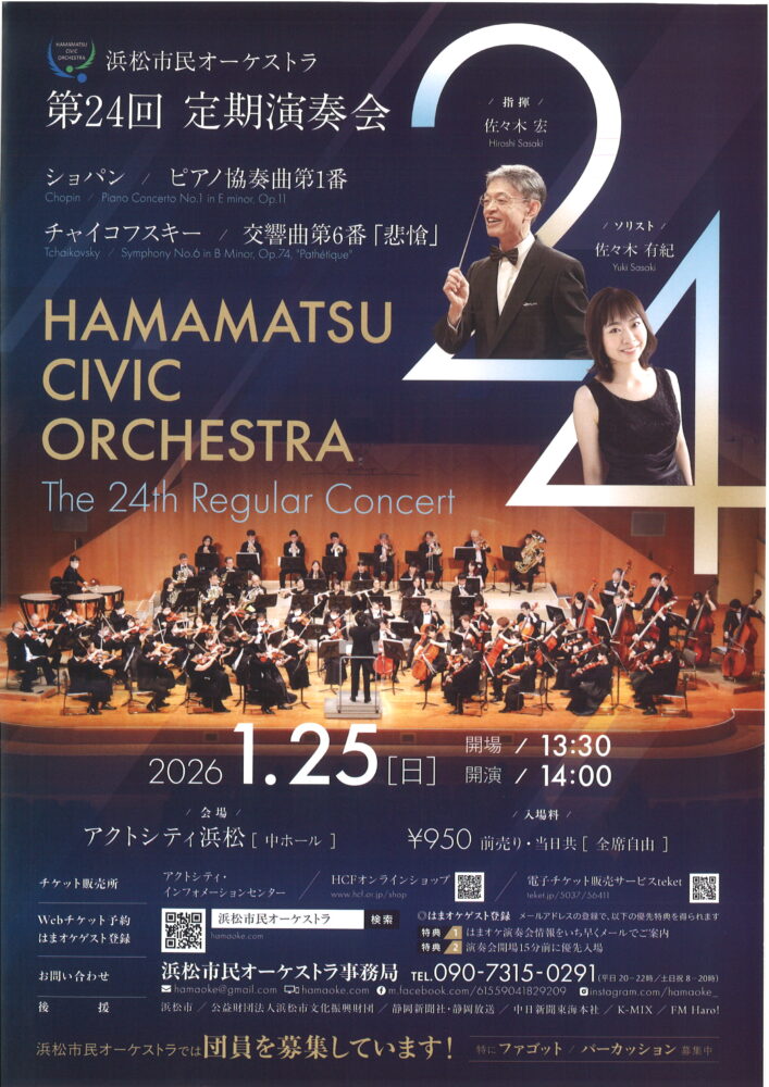 | 問い合わせ | 浜松市民オーケストラ 電話:090-7315-0291(平日20~22時/土日祝8~20時) E-mail:hamaoke@gmail.com |