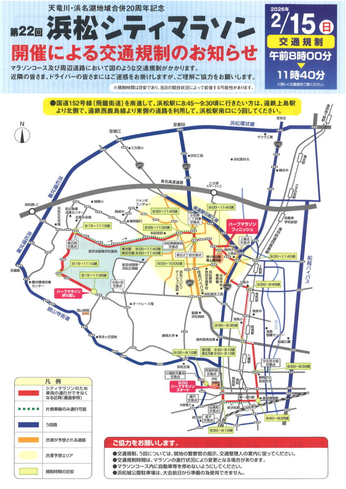 - 浜松シティマラソン開催による交通規制のお知らせ 2/15(日) 2026年1月26日