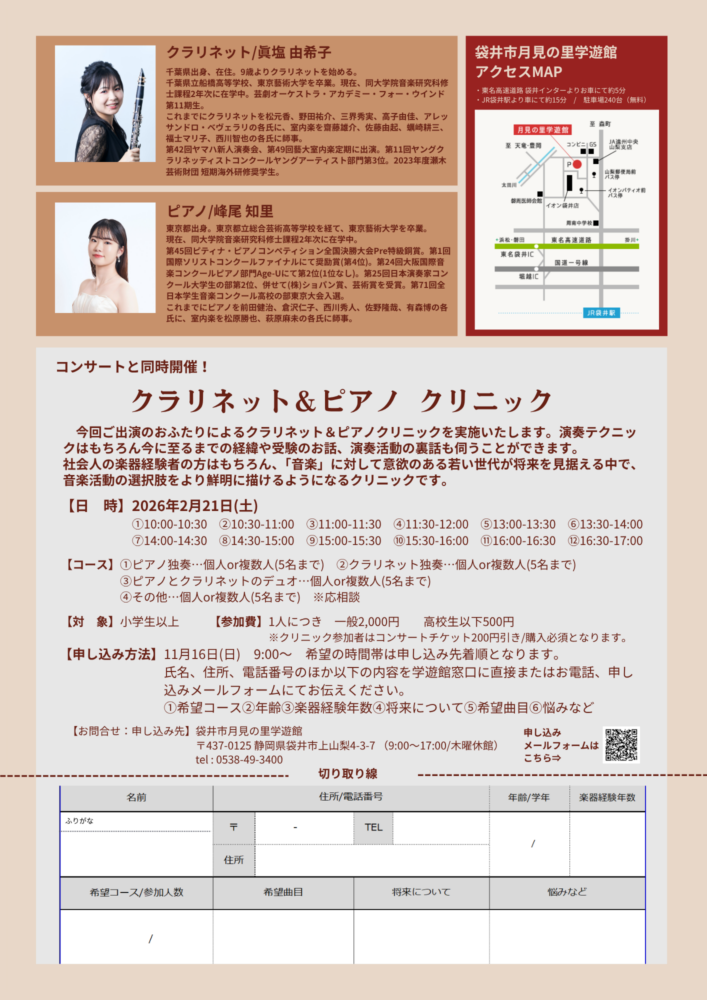 クラリネット(眞塩由希子)&ピアノ(峰尾知里)デュオコンサート @袋井市月見の里学遊館