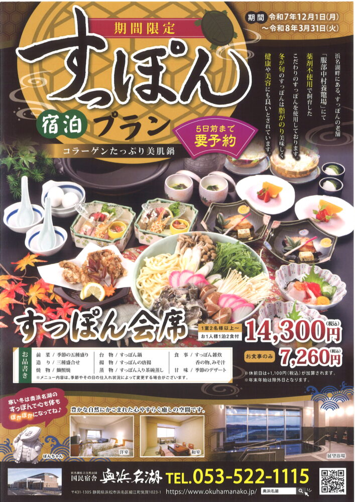 - 国民宿舎 奥浜名湖 期間限定すっぽん宿泊プラン 3/31まで 2026年2月2日