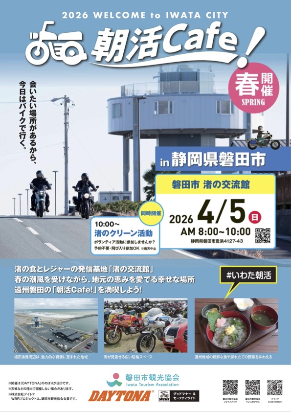 「磐田市渚の交流館」で開催される「渚のクリーン活動」にあわせて、オートバイライダーのライフスタイルを応援する「朝活Cafe」(AM8:00~10:00)が開催されます。